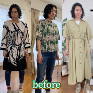 色に加えて、襟の形、柄の3つの要素をみていただいて 「気に入って買っハズなのに、いざ着てみるとイマイチでお蔵入りになっている服」は、今日の診断ではNGなものだと判明して「そういうことか!」と合点がいきました。 「好きだけど着るとイマイチな服」とか「昔はよく着たけど最近は着なくなった服」は、もう未練がましく残さず、さっさと断捨離しよう!という気持ちになりました。  そして、これから買う服も、今日の診断を基準に買う・買わないをサクッと決められそうです。(お陰様でネットショッピングの「お気に入り」も早速整理できました!)