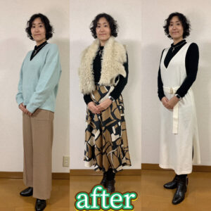 また、子供のころから顔が大きいと思ってコンプレックスでしたが、診断で首が細くて顔が大きく見えていたことがわかりました。更に似合う襟の形を着るようになって、お客様から「小顔だね」といわれるようになり、本当に驚いています!顔が大きいと思っていたのに、小顔だと言われて本当に嬉しいです!